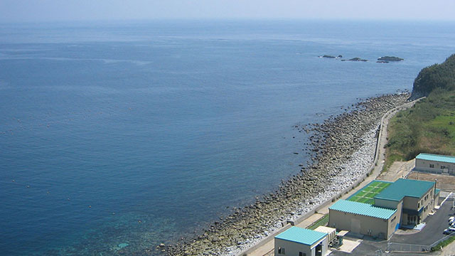 こしき島の手打湾では、国定公園に指定された豊かな自然環境のもと、沖合わずか4kmの近距離で水深375mから海洋深層水を取水できます。