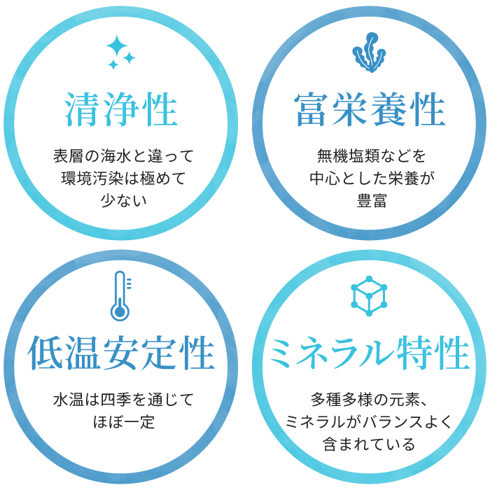 光の届かない水深200mより深い層の海水で、植物プランクトンが光合成で使用する栄養素が消費されずに豊富に残っています。また水圧が20気圧以上の深海なので、ミネラルがイオン状態で溶け込んでいるから、体になじみやすい飲料水です。